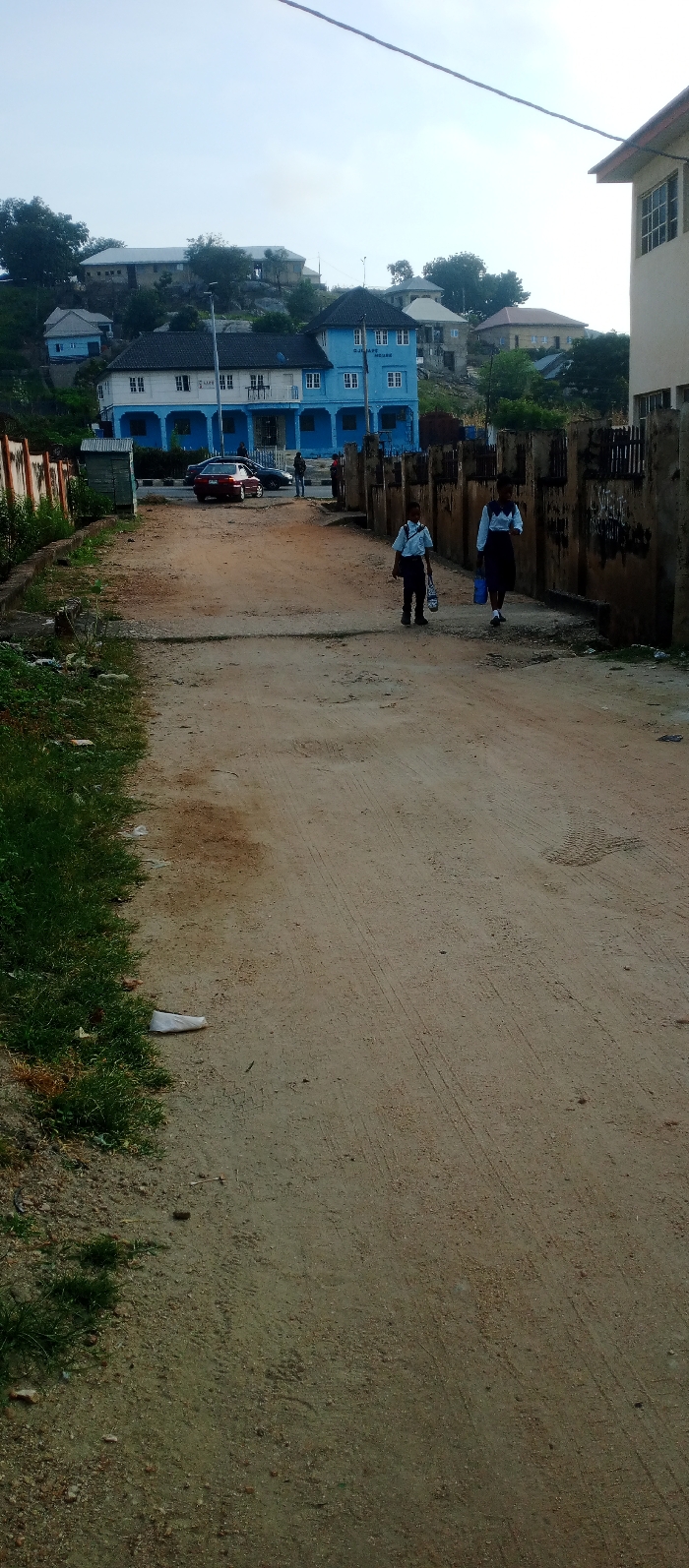 A dirt road runs through a residential area. Two students in uniform walk along the road, carrying bags. Behind them, cars are parked near a blue and white building. Grass and some debris are on the left side of the road, while a concrete wall is on the right. Houses are built on a hillside in the background. The sky is overcast.