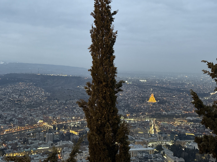 - "The image presents an elevated, wide-angle nighttime view of the city of Tbilisi, Georgia, observed from a western or southwestern vantage point overlooking the urban area" by FM-LN1lQ2, licensed under CC BY 4.0