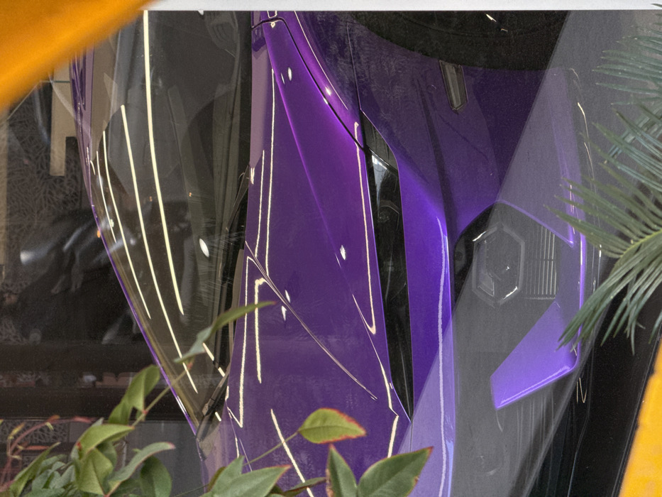 A metallic purple high-performance sports car, identifiable as a Lamborghini, is displayed within a luxury car showroom in Monaco, Monaco. The image focuses on the front section of the vehicle, showcasing its sculpted hood, angular LED headlights, and lower bumper assembly which includes a prominent central hexagonal grille and a distinct purple-accented front splitter. The car's highly reflective paint and windshield exhibit numerous horizontal streak reflections from overhead fluorescent lighting, confirming an indoor, controlled environment. A blurred, dark reflection of a figure or internal architecture is visible within the windshield. Green foliage, consisting of broad leaves and palm-like fronds, partially obstructs the view from the immediate foreground, suggesting decorative plants positioned in front of the vehicle or observed through a window. Minor dust or smudges are present on the car's exterior surfaces. No individuals are clearly visible or actively engaged in the scene.
