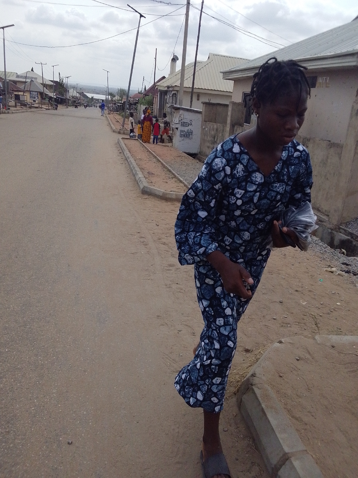 This image depicts a daytime street scene in Lokoja, Nigeria, under an overcast sky