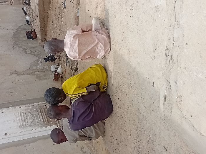 The image displays four young individuals, likely children, seated on light-colored, unpaved dirt ground in the city of Ayama, Nigeria