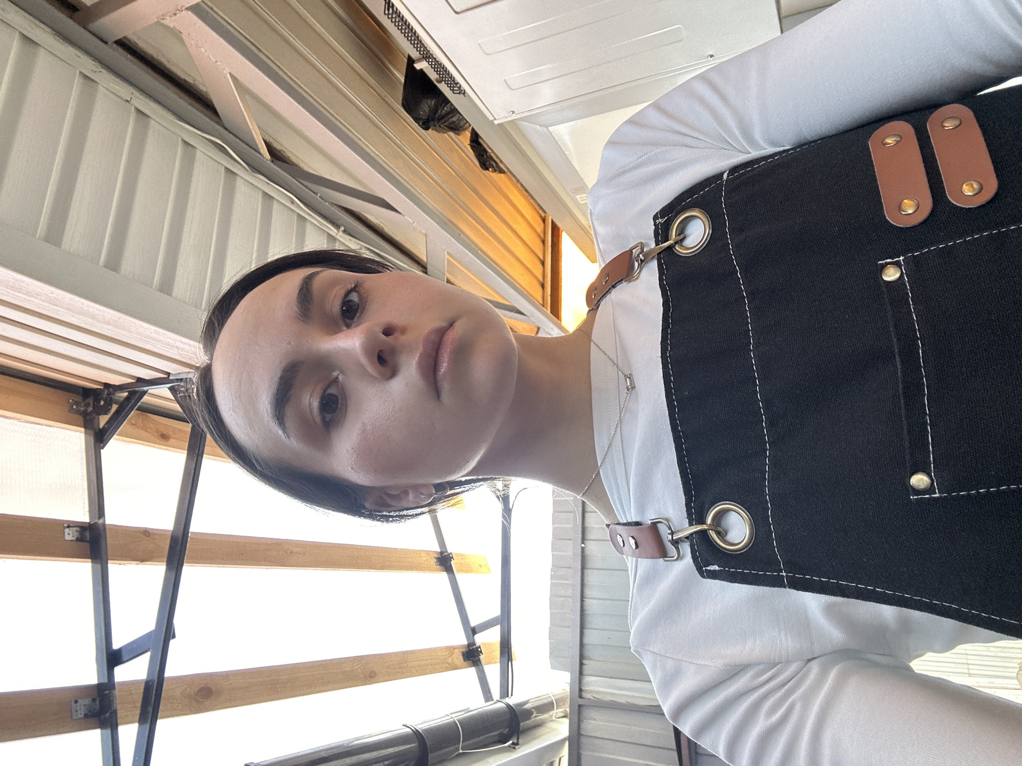 A woman with dark hair is facing the camera from a low angle. She is wearing a white long-sleeved shirt and a black apron with brown leather straps and metal hardware. The background consists of the ceiling of a building, possibly a garage or warehouse, with exposed wooden beams and metal supports. Part of the structure is lit by natural light. The location is possibly in the city of посёлок опытного хозяйства «Ермолино», Russia.