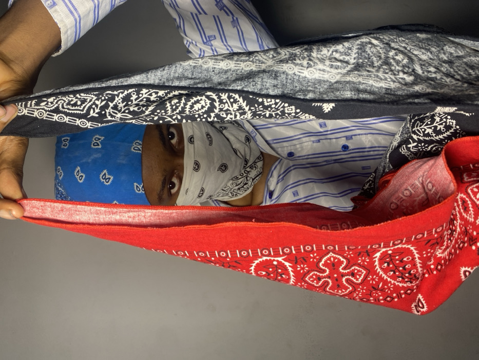 The scene depicts an individual located in Ngleshi Amanfro, Ghana, against a plain dark grey background. The subject has dark skin and is wearing a blue bandana on their head, a light grey bandana with a paisley pattern covering their nose and mouth, and a light-colored button-up shirt with thin blue stripes. Their eyes are visible between the two bandanas and are looking directly forward. The individual's hands are holding up three bandanas: a red bandana with a white paisley pattern on the left, a black bandana with a white paisley pattern on the right, and a third patterned bandana partially visible beneath the others. The bandanas are suspended vertically, partially obscuring the subject's torso and face.