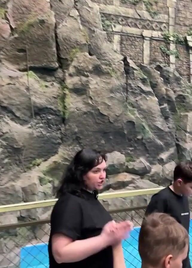 group of people walking along an elevated walkway over a blue water feature in an indoor setting. The walkway has yellow railings and a chain link fence. The setting features large, artificial rock formations and architectural elements resembling ancient ruins. There is also a large artificial tree. People can be seen below the walkway, along with a restaurant or seating area. The video follows the group as they walk along the walkway, showing their interactions and observations of the surroundings.