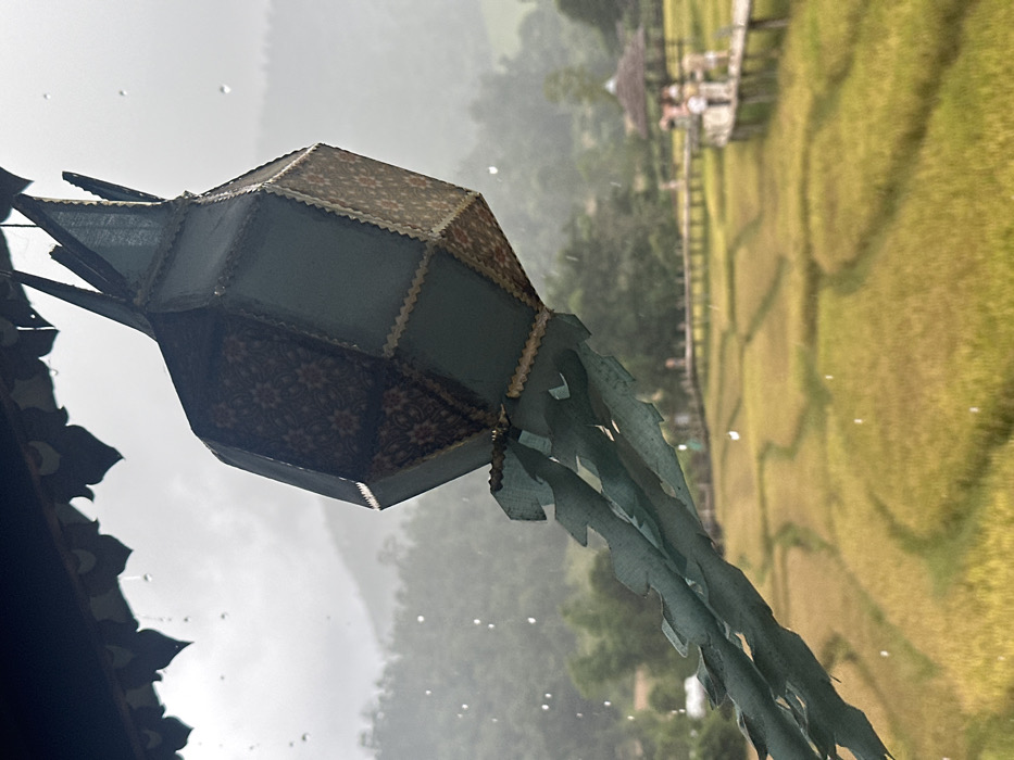 A greenish-blue, multi-faceted decorative lantern, adorned with patterned panels and hanging fabric tassels, is suspended from an ornate dark wooden roof overhang in the foreground. Raindrops are visible in the air, suggesting an active rain shower. In the midground, a golden-yellow rice field, characterized by curved embankments, extends outwards. A wooden boardwalk meanders through the rice field, leading to a small, open-sided gazebo with a conical roof. Several indistinct human figures are present on the boardwalk, primarily near the gazebo, engaged in walking or observation. The background features hazy green mountains partially obscured by mist or rain, under an overcast sky. The scene is located in Ban Paem Bok, Thailand.