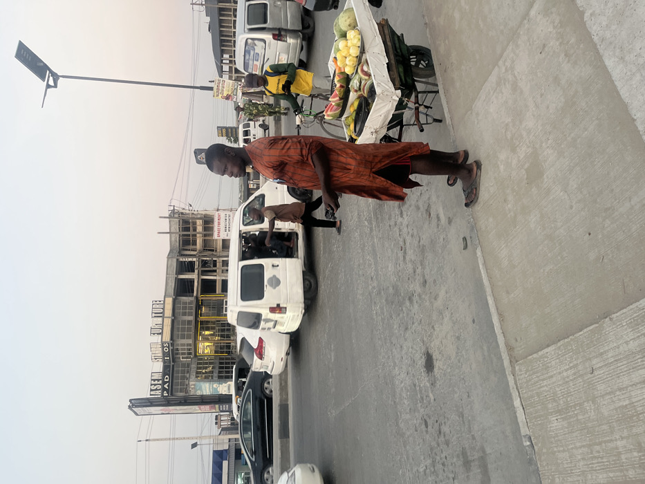 A man in an orange shirt and sandals walks along a concrete sidewalk near a street. A cart filled with fruits sits nearby. Further into the street, a white van with its door open has a person exiting. Cars and a building under construction are also visible. A street light stands tall, with a clear sky in the background.