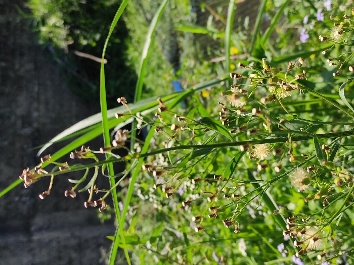 The image displays an outdoor scene focusing on dense vegetation under bright sunlight. A tall, slender, green-stemmed herbaceous plant dominates the central and upper portions of the frame, characterized by numerous small, light brown dried flower heads and several white, fluffy seed clusters indicative of a composite plant in a seeding stage. This plant is surrounded by various green foliage, including broad leaves and narrow, grass-like blades, with scattered small, light purple flowers visible in the lower-left quadrant. In the upper-left and central background, a dark gray, textured surface consistent with a concrete wall or barrier is partially visible. The upper-right background shows blurred green and yellow vegetation. No individuals or specific identifying landmarks for Nieste, Germany, are present within the frame.