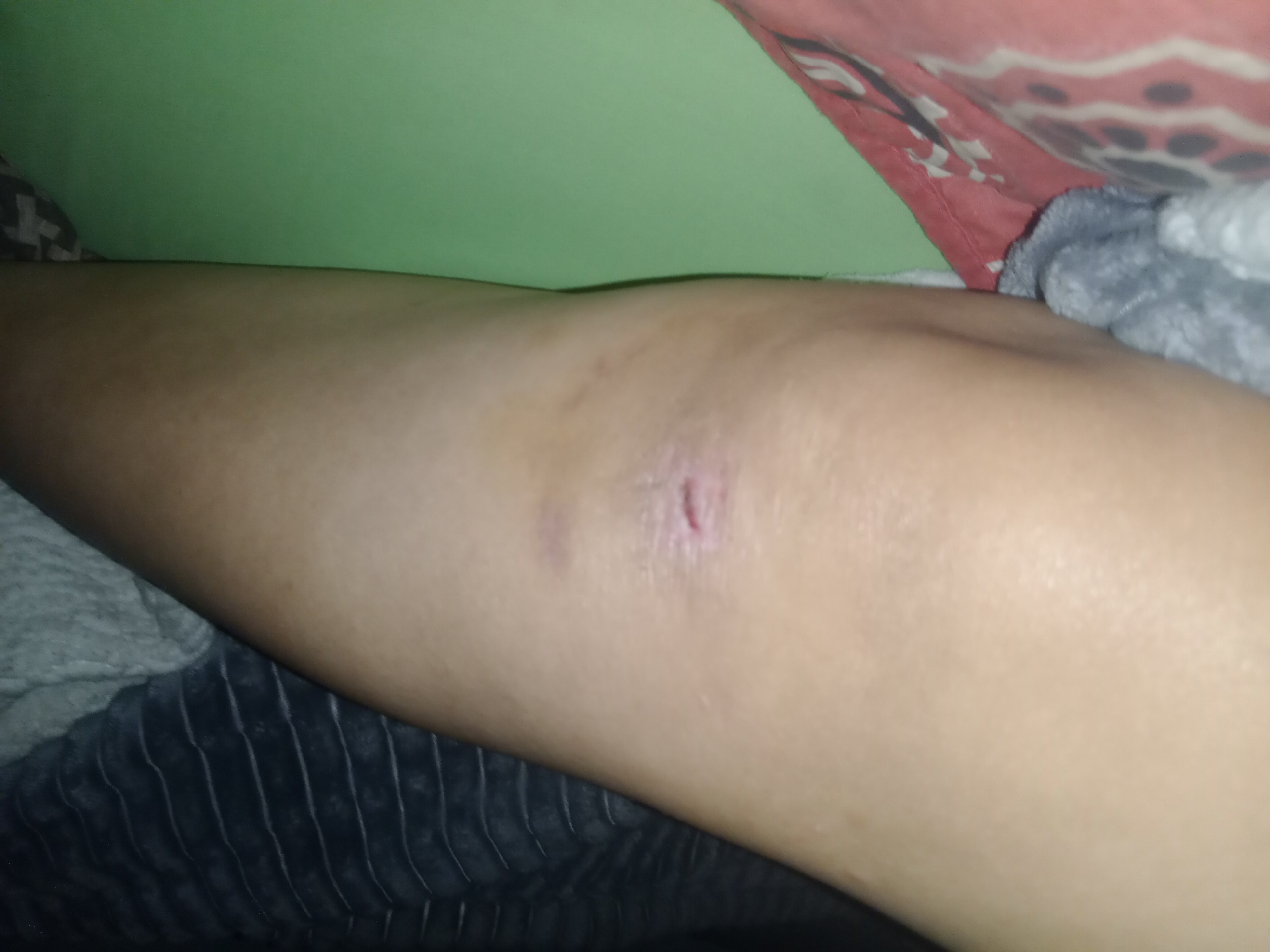 close-up of a person's knee. There appears to be a healing wound or scar on the knee. The background includes bedding with different textures and colors. The specific location within Villa Ballester Noroeste, Argentina, cannot be determined from the image.