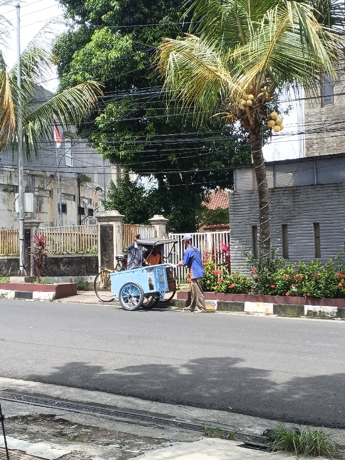 A street vendor pulls a blue cart along a road. He wears a blue shirt and tan pants. The cart has a bicycle attached. A person sits in the cart. A palm tree with coconuts stands near a building with closed shutters. A building behind a fence has a red and white flag flying. Green trees and red flowers are also visible.