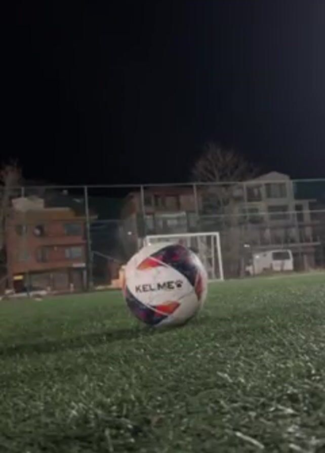 person on a soccer field at night. The field is illuminated by artificial lights. In the first frame, a white and multi-colored soccer ball is on the grass. In the following frames, a person wearing white shorts, a light blue jacket, and light-colored shoes kicks the ball toward a soccer goal. The person appears to be male. Buildings are visible in the background, with a fence separating the field from the buildings. The sky is dark.