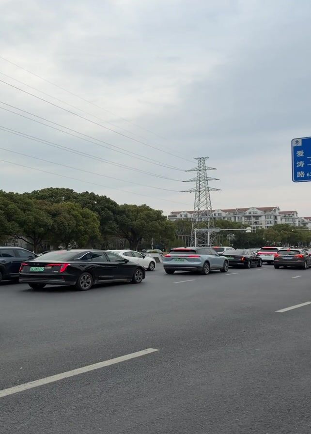 busy street in what appears to be an urban area. Several cars are visible, mostly moving slowly or stopped in traffic. Some cars have green license plates, likely indicating they are electric or hybrid vehicles. The sky is overcast. Trees line the side of the road and a large electrical transmission tower stands in the background. A blue road sign is visible, possibly indicating directions and distances to nearby locations.