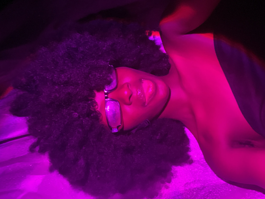 - "A person with voluminous curly hair and glasses lies on a surface illuminated with purple and pink light" by FM-eqkm83, licensed under CC BY 4.0