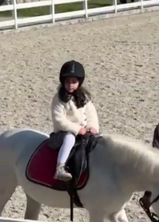 A young girl with dark hair is riding a white pony