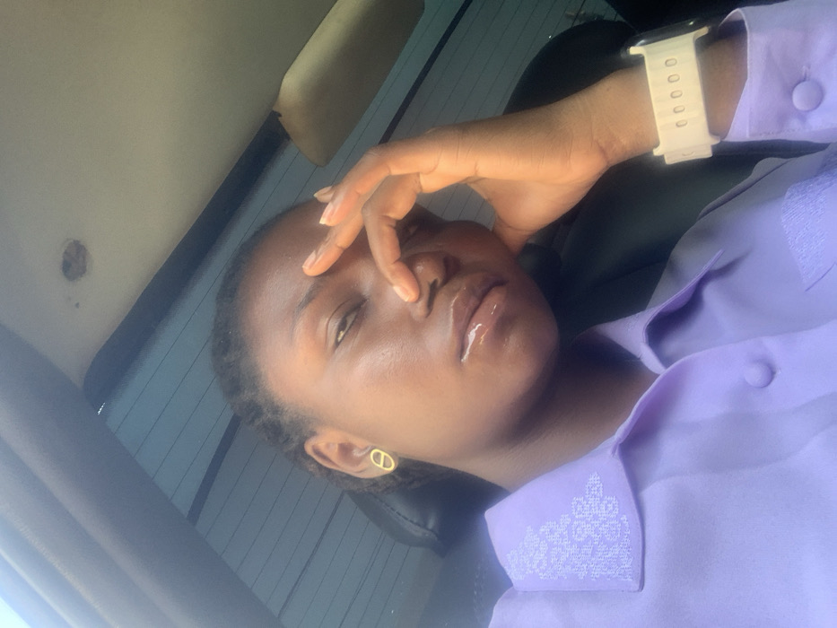 A young female subject with a dark complexion is depicted seated inside a vehicle in Arawa, Nigeria. She wears a light purple button-up shirt featuring white patterned embroidery on the collar. A gold-toned, elongated oval earring is present in her left ear, and a light-colored wristwatch with a wide, ribbed strap is on her right wrist. Her right hand is raised, with fingers partially covering the right side of her forehead and temple. Her lips appear glossy, and her gaze is directed towards the camera. The vehicle's interior shows a dark-tinted window and a light-colored headliner with visible wear, including a dark irregular stain and a section of detached fabric.
