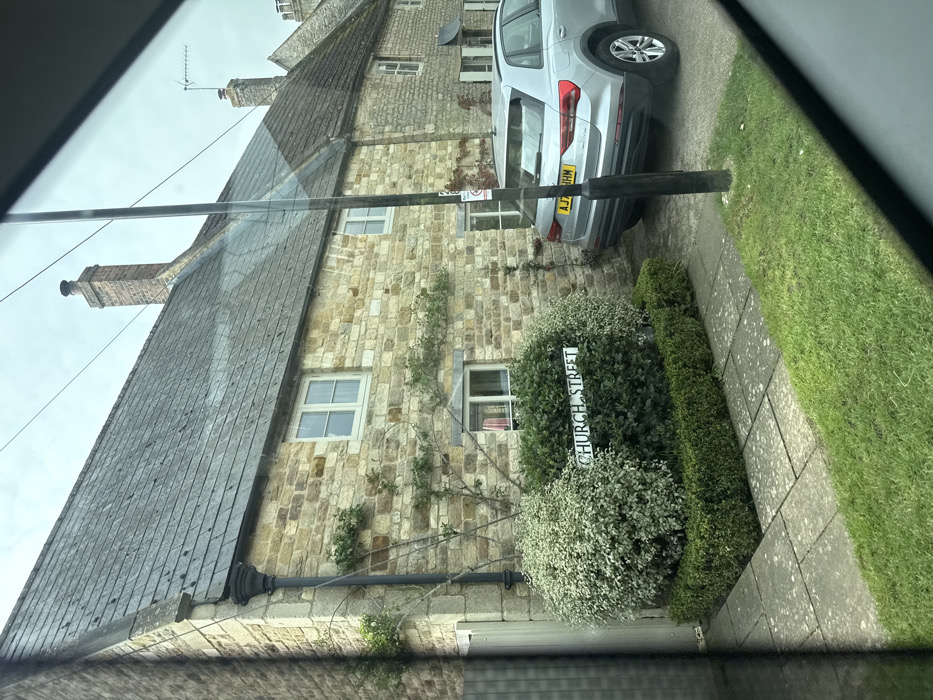 The scene depicts a residential street in Warmington, United Kingdom, specifically at the intersection or stretch identified by a "CHURCH STREET" sign. A two-story stone house with a grey slate roof and multiple white-framed windows dominates the left and center. A black downpipe runs vertically on its left facade, and climbing plants are visible on the stone walls. A brick chimney stack is present on the roofline. In front of the house, a landscaped area contains a large variegated shrub with light and dark green foliage, another dense dark green shrub behind it, and a neatly trimmed box hedge forming a border. The white rectangular "CHURCH STREET" sign with black lettering is embedded within the darker green shrub. To the right of the bushes, a silver/light grey SUV, bearing the license plate "AJ71 JHM," is parked on a paved surface adjacent to the house. A black lamppost stands in the immediate foreground, partially obscuring the vehicle; a small red and white sign is affixed to it. The ground consists of grey flagstone pavement in front of the hedges, transitioning to a strip of green grass. The sky overhead is overcast. The image appears to be captured from inside a vehicle, as evidenced by reflections on a window surface and a dark frame visible along the periphery. No individuals are present, and no actions or interactions are depicted.