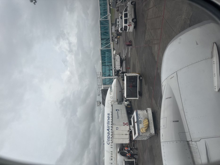 An airplane at an airport is shown from inside another plane. The view through the window includes the wing of the observer's aircraft. Adjacent is a Copa Airlines plane, docked at gate 122 with ground service equipment attached. Gray, overcast skies loom above the passenger boarding bridge. Multiple service vehicles are also visible on the tarmac.