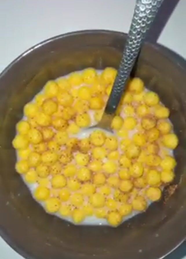 A high-angle, static shot shows a bowl of cereal. The bowl is dark grey and contains yellow, round cereal pieces submerged in milk. A silver spoon with a textured handle is inside the bowl. There is a sprinkling of brown powder, possibly cinnamon, on top of the cereal. The bowl sits on a white surface with a hint of pink in the top left corner.