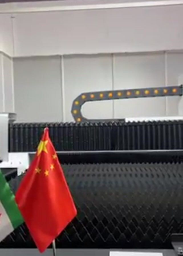 machine with a flag of China displayed prominently on a table in front of it. The machine, which appears to be automated, is enclosed in a white or light-colored structure. Part of the machine is visible above the table, including a gray, curved chain-like structure with round orange sections. The table also has a small flag from another nation (perhaps Syria or the United Arab Republic) and a card with a QR code. A person is briefly visible in the background to the left of the machine. The environment suggests a trade show or exhibition hall with artificial lighting.