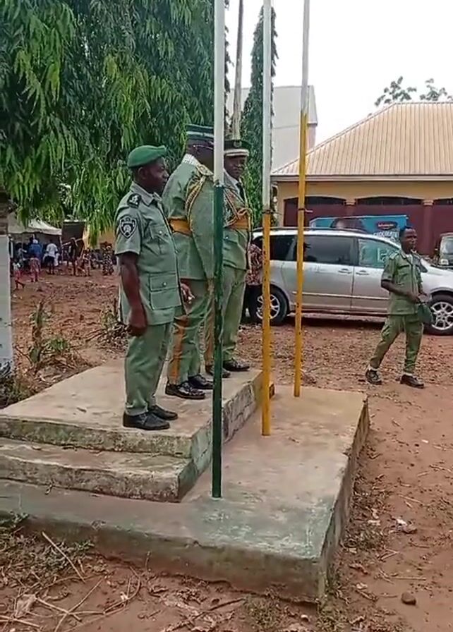 Here is a detailed description of the video: The video shows three uniformed men standing on a concrete platform next to three flagpoles. They are wearing olive green uniforms, black shoes and caps. One of the men has a green beret. A man in a similar uniform is walking away from them, on the ground. Behind the group of men and to the left of the frame, several people stand in the background. Behind the men on the platform, there is a silver minivan and a building with a light-colored corrugated metal roof. There are trees to the left of the frame. The ground is reddish dirt covered with leaves and small branches. The video is shot outdoors in daylight. A band plays loudly in the background.