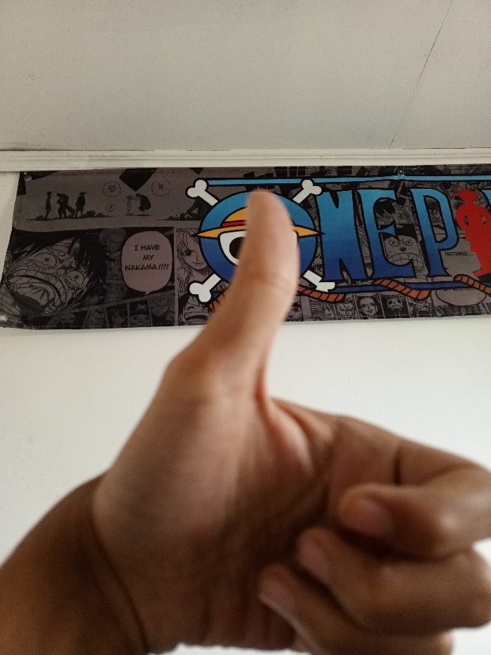 - "A hand giving a thumbs up in front of a One Piece poster" by FM-CwWFM2, licensed under CC BY 4.0