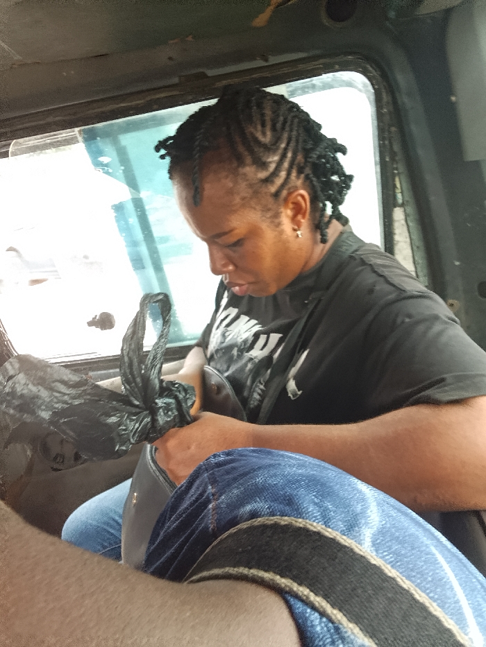 The image depicts a Black woman seated inside a vehicle in Satellite Town, Nigeria, observed from a slightly elevated passenger perspective. The woman, shown from the chest up, has cornrow braids styled into twists and wears a black short-sleeved t-shirt with a white graphic design. A small, gold-colored cross earring is visible in her right ear. She is focused downwards, using both hands to handle a tied black plastic bag in conjunction with a dark-colored handbag resting on her lap. Her lower body is clad in blue jeans. The vehicle's interior features a dark ceiling and window frame. A brightly illuminated, indistinct outdoor scene is visible through a light blue-tinted side window. In the foreground, parts of another individual's arm and leg, wearing blue jeans, are present.