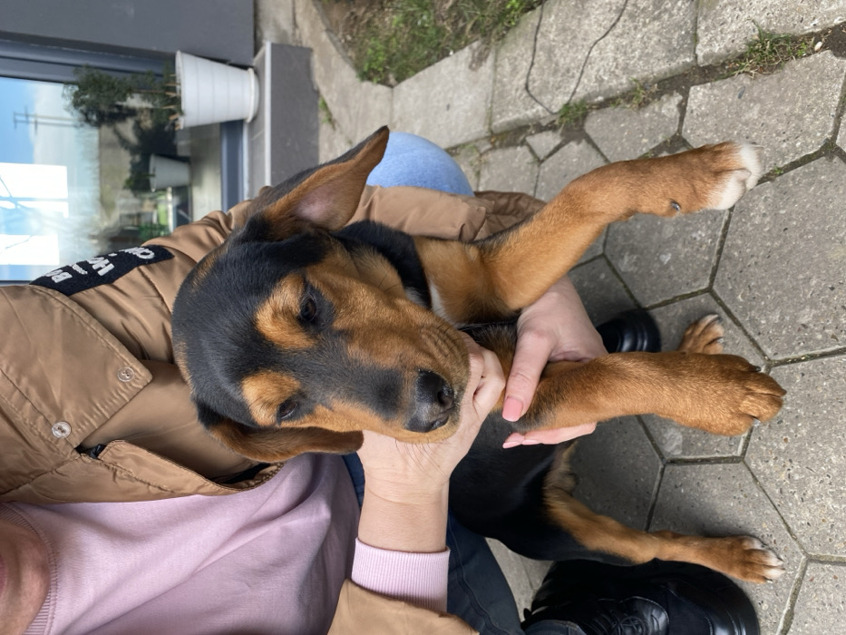 The scene is set outdoors in Palilula Urban Municipality, Serbia, featuring a partial view of an individual holding a dog. The person, visible from the chest down, wears a light brown padded jacket with black text patches on the left arm, a light pink long-sleeved shirt, and light blue jeans. Black footwear is visible on the left foot. Their hands, with pink-painted fingernails, support a medium-sized dog with short black and tan fur. The dog displays tan markings on its face, ears, legs, and underbelly, along with a small white patch on its chest and a visible black collar. Its eyes are partially closed. The ground is paved with hexagonal concrete blocks, with a narrow strip of dirt and sparse grass visible to the right. In the background, a modern building entrance or large window reflects a bright, cloudy sky with a visible power line or pole. Two white potted plants, one tall and one short, are positioned on either side of a dark gray step leading to the entrance.