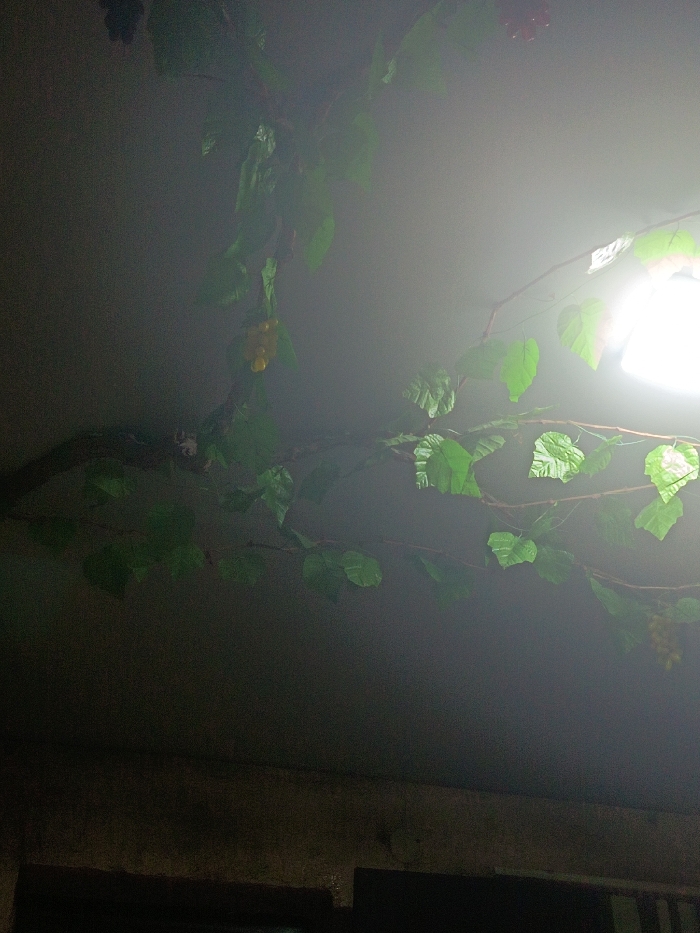 A dimly lit indoor scene focuses on artificial vines with green leaves and clusters of grapes hanging from the ceiling. The lighting is poor, with a bright light source dominating the upper right, casting a diffused glow. A portion of a dark wall or structure is visible at the bottom of the frame.