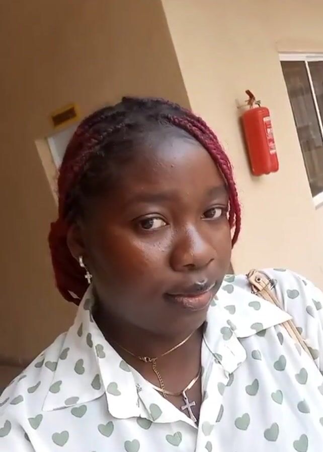 A woman is filming a selfie-style video of herself on a covered walkway or balcony. She has dark skin and is wearing a white button-up shirt with green hearts, black pants, and a gold necklace with a cross pendant. Her hair is styled in red-tinged braids. Behind her, there is a beige wall with a fire extinguisher, a closed door, and a white railing. The camera angle is slightly tilted.
