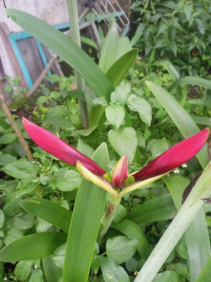 The image displays a close-up of a plant with a developing flower bud in Bamhori, India. The central subject is a deep red, elongated flower bud, with two petal-like structures partially opened and extending horizontally. A smaller, central bud remains enclosed. The base of the bud is yellowish-green, connecting to a thick green stem with faint reddish-brown streaks. Multiple long, strap-like, dark green leaves emanate from the plant's base. The background comprises dense, mixed green foliage, including smaller, lighter green plants with visible leaf textures. In the upper left quadrant, out-of-focus elements include a light blue rectangular frame and indistinct metallic structures, indicative of an outdoor setting. No people or specific actions are depicted.