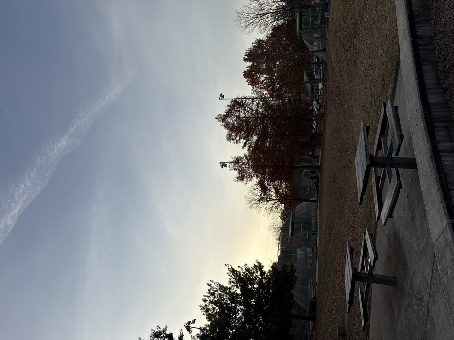 A park scene shows picnic tables on concrete near trees with changing leaves. In the background, cage-like structures stand amidst the trees, possibly baseball field netting. The sky transitions from a clear blue with a jet contrail to a lighter hue near the horizon, suggesting dawn or dusk. A concrete structure or ledge defines the edge of the park area.