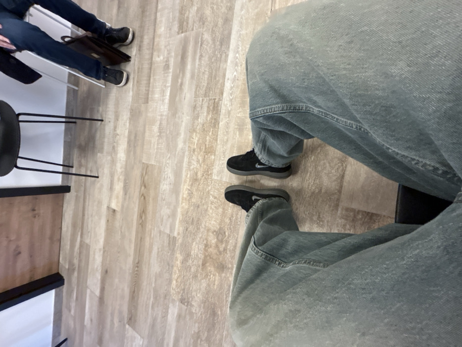An indoor scene, likely a waiting area or office, in Strasbourg, France. The perspective is from a seated individual, viewing their own legs and feet in the foreground and another seated person in the background. The floor consists of light-colored wood-look laminate or vinyl planks. The foreground subject wears light blue denim jeans and black low-top sneakers with grey soles and a visible Nike swoosh. In the mid-ground and background, a second individual is seated on a white chair, wearing dark blue jeans and dark low-top sneakers with white soles. A dark brown briefcase rests between the second individual's feet, with a dark jacket draped over their lap. An empty black chair with thin metal legs is positioned to the left of the second person. A light brown wooden door with a dark frame is partially visible in the left background, adjacent to a white wall. Both individuals are stationary.