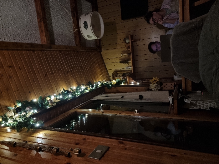 A cozy, dimly lit wooden cabin interior is shown. A garland of greenery and lights adorns a ledge above a window. A floor lamp hangs from the ceiling. Two people are visible in the background; one is seated, eating, while the other is using a laptop. The focus is on the wooden surfaces and reflective window. A fireplace bellows and antique tools are on the counter.