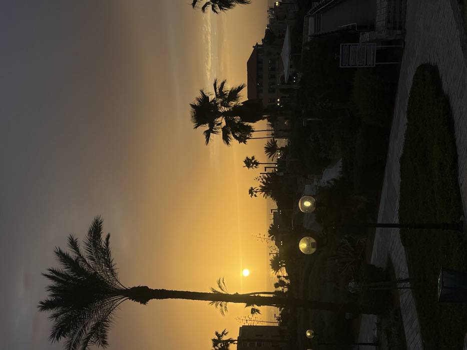 This image captures a sunset over the Mediterranean Sea from a park or promenade in Tel Aviv-Jaffa, Israel. The sky exhibits a prominent gradient, transitioning from a brilliant yellow-orange at the horizon, where the sun is visible as a distinct spherical orb, to a darker grey-blue at the top. The low sun is positioned centrally on the left, casting a shimmering reflection across the sea surface. In the foreground and midground, numerous palm trees are silhouetted against the bright sky, with a tall, slender palm tree dominating the left side of the frame. A paved pathway, light in color, curves through the lower left, bordered by dark green grass and dense shrubbery. Several spherical streetlights on dark poles are visible along the path, emitting a warm, yellow-white glow, with two particularly prominent in the lower left quadrant. A dark, rectangular receptacle is present in the extreme lower-left corner. To the right, on an elevated terrain, a multi-story building featuring a reddish-brown tiled roof and lighter-toned walls is visible, partially obscured by the ambient darkness. Adjacent to this structure, a white outdoor umbrella or canopy is discernible. An elevated pedestrian bridge or walkway descends towards the right side of the frame, and a dark signpost with unreadable text stands beside it. The Mediterranean Sea extends across the background horizon. No individuals or active subjects are present in the scene.