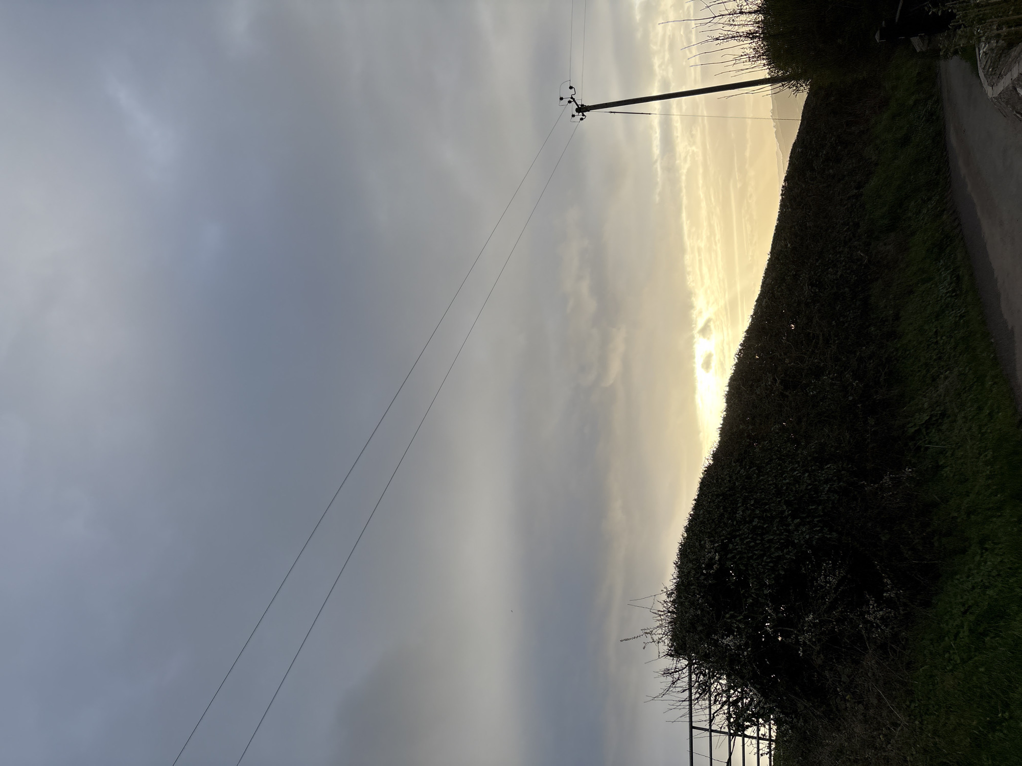 rural road scene in Shrewsbury, United Kingdom. A utility pole with attached wires stretches across the sky on the left, contrasting with a hedge-lined road curving right on the right side of the image. The sky is overcast with diffused sunlight breaking through, creating a bright horizon. A small section of a metal fence is visible at the bottom of the frame, partially obscured by vegetation. The road appears paved and is bordered by grass and dense foliage.