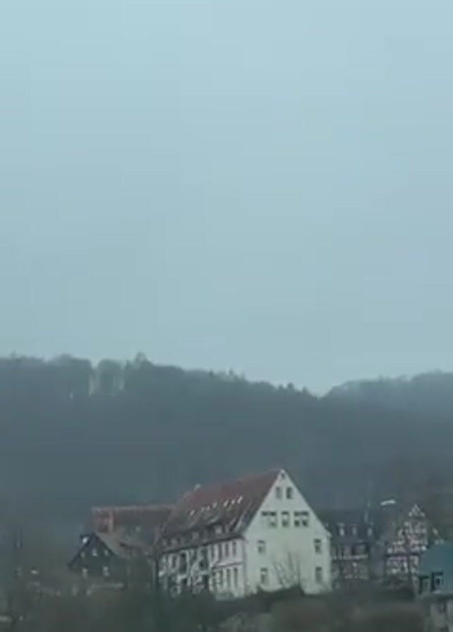 hillside with buildings and trees, under a cloudy, grey sky. The buildings are varied in style and color, and some show signs of snow on their roofs. The trees are mostly bare, suggesting winter. The hillside slopes upward towards a crest covered in trees. In the distance, a tall, thin structure is visible atop a hill. The camera is moving, likely from a vehicle. Overall, the scene presents a muted, cold, and possibly rural environment.