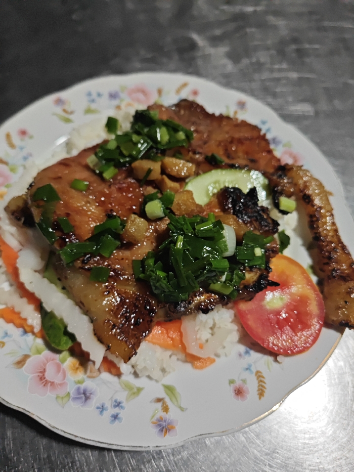 - "A plate of Vietnamese cơm tấm (broken rice) features grilled pork chop topped with chopped scallions and fried garlic" by FM-CuMMb2, licensed under CC BY 4.0