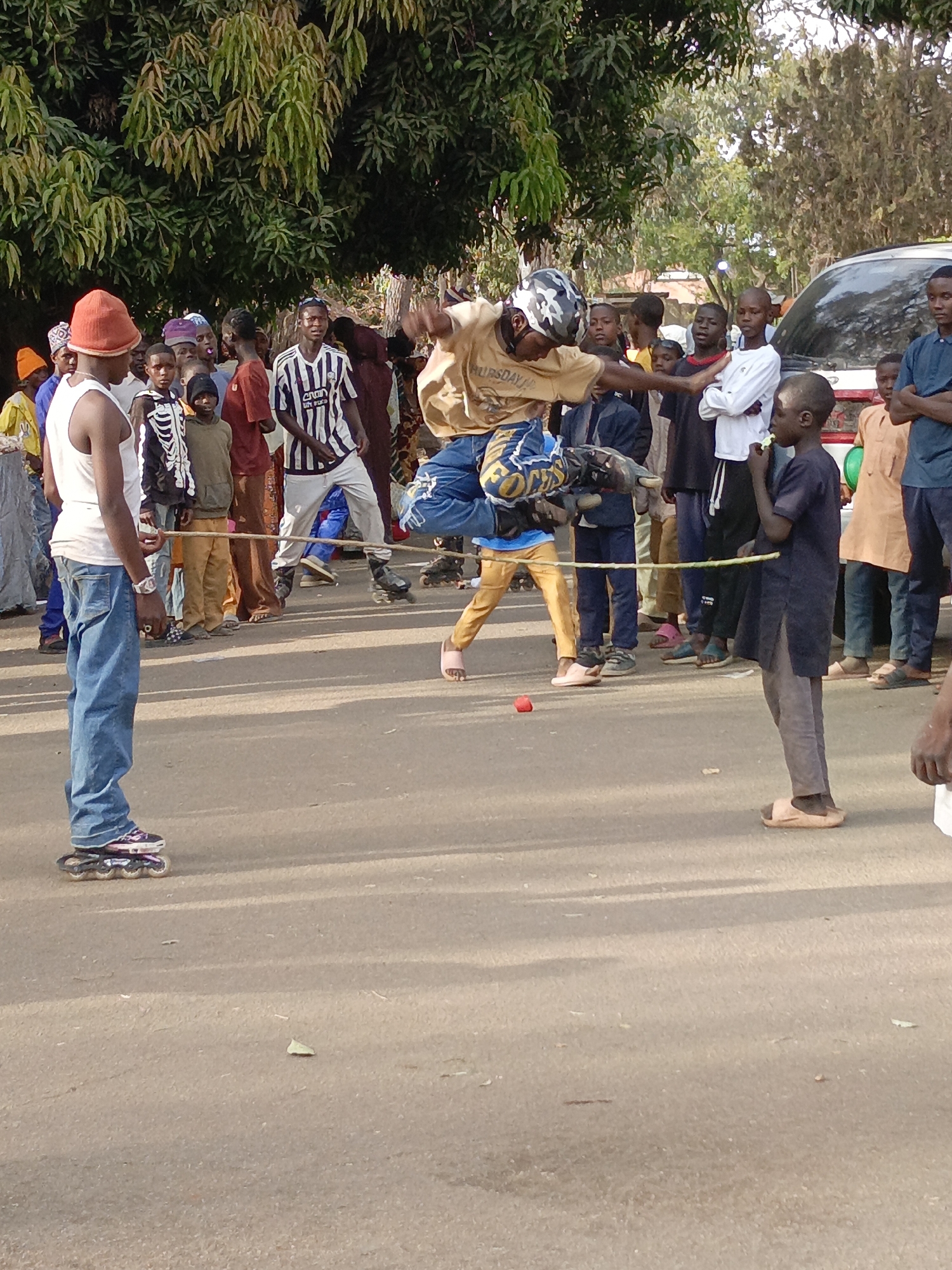 The image depicts an outdoor recreational activity on a paved, light-colored surface during daylight hours, presumed to be a street or open area in an unknown city, unknown country. The central figure is a young male, positioned horizontally in mid-air, having just cleared a low, yellow-green stick or thin branch. He wears a beige t-shirt, blue jeans, inline rollerblades, a camouflage-patterned helmet with a dark visor/goggles, and dark gloves. The stick is held by two individuals. On the left, a young male wearing a white sleeveless top, blue jeans, an orange beanie, and inline rollerblades holds one end. A white wristwatch is visible on his left wrist. On the right, a young male wearing a dark blue tunic-style shirt, gray trousers, and light brown sandals holds the other end of the stick. A small red spherical object rests on the ground between the participants. Approximately 20-30 onlookers, predominantly young males, are gathered in the background and to the sides of the primary activity. Their attire is varied, including casual t-shirts (one with black and white stripes, another with a white skeleton design on a black hoodie), trousers, and some traditional-looking garments. Lush green foliage from large trees dominates the upper background, with some bare branches visible. A portion of a white vehicle, likely an SUV or van, is visible in the upper right background. The lighting indicates natural daylight, casting soft shadows on the ground.