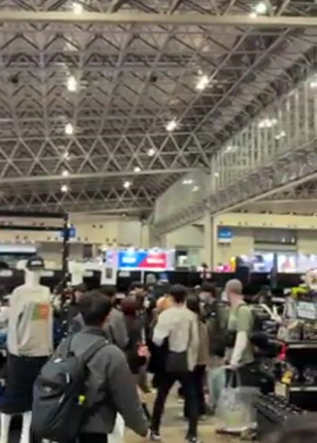 large indoor convention space bustling with people. The camera pans across the scene, revealing various vendor booths displaying merchandise, including clothing, accessories, and collectibles. People are walking through the aisles, browsing the items and making purchases. The convention hall has a high ceiling with visible metal support structures and numerous lights. Overall, the scene appears to be a busy and crowded convention or trade show.