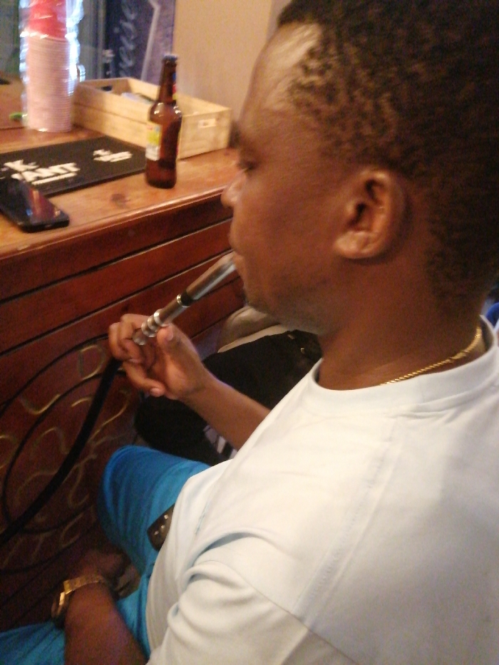 A man is shown from the side, holding a hookah pipe to his mouth