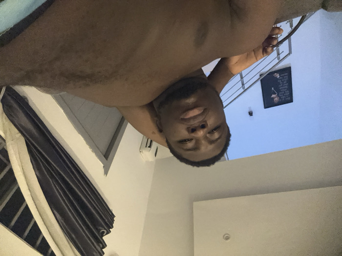 A shirtless man gazes directly at the camera with a neutral expression. He stands in what appears to be a bedroom or living room with grey and white walls. A window with dark, flowing curtains is visible to the left. Behind him, a staircase with metal railings leads to an upper level where a framed image hangs on the wall. The room is illuminated by a soft, diffused light.