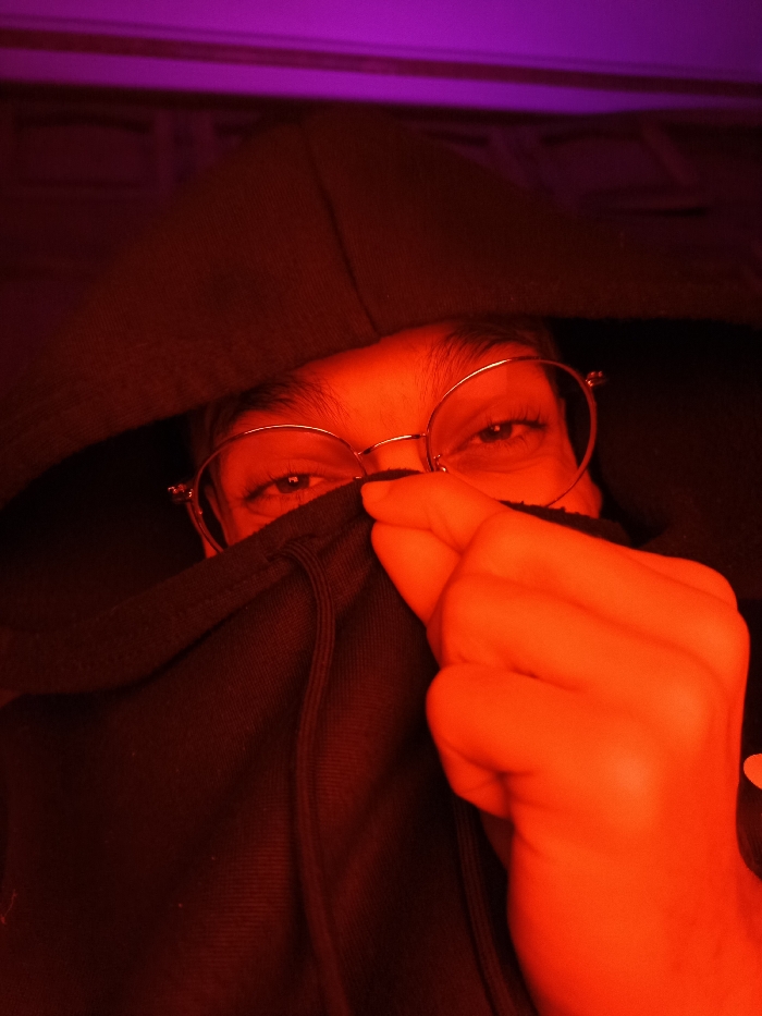 A person wearing glasses and a dark hooded garment is partially obscured by the pulled-up fabric, held by their hand, covering part of their face. Their eyes are visible above the fabric. The scene is illuminated with a red and purple color cast. The background appears to be a textured ceiling or wall.