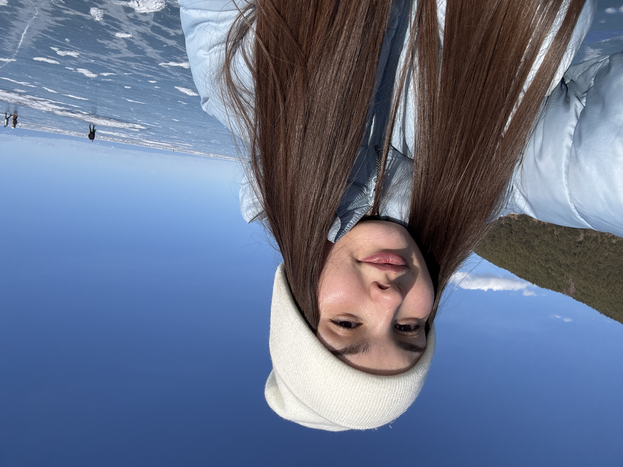 A young female is depicted in a close-up selfie taken on the frozen surface of Lake Baikal, near Listvyanka, Russia