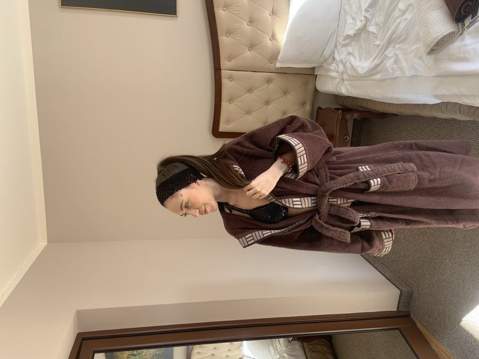 In a hotel room in Kladnitsa, Bulgaria, a female subject with medium-length brown hair, pulled back into a ponytail and adorned with a black knitted headband, is depicted in a three-quarter profile facing left. She wears a dark brown terrycloth bathrobe with a geometric light-colored trim, cinched at the waist, revealing a black sequined halter-neck top. Her left hand is raised near her collarbone, touching her hair or the bathrobe. A red beaded bracelet is visible on her left wrist. She exhibits a subtle smile. The immediate environment includes a bed on the right with a light beige, tufted headboard and white, partially disheveled linens. A stack of folded white and brown towels rests on the foot of the bed. A dark wooden nightstand is positioned between the subject and the bed. To the left, a tall, dark-framed mirror reflects a portion of another room, revealing a similar bed and tufted headboard. The room features light beige walls and a gray carpeted floor. A dark-framed picture or screen is partially visible on the far right wall. Natural light illuminates the scene from an unseen source to the left.