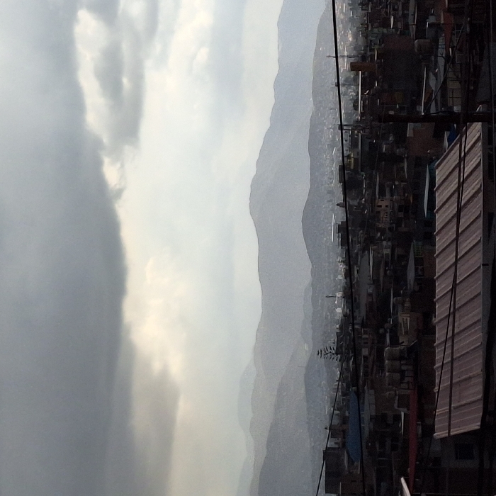 An aerial view captures a cityscape nestled before hazy, layered mountains under a cloudy sky. Houses and buildings are densely packed, with electrical wires crisscrossing the scene. The sky is overcast, and the overall tone of the image is muted and atmospheric. The perspective suggests a high vantage point, looking down upon the urban sprawl and towards the distant mountains.