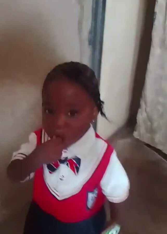 A young child wearing a school uniform is standing in front of a white wall. The child is wearing a white shirt, red vest, and dark blue shorts. The child has small braids. The child is holding a green juice box and putting their finger in their mouth. An adult is speaking to the child, calling them “baby.”