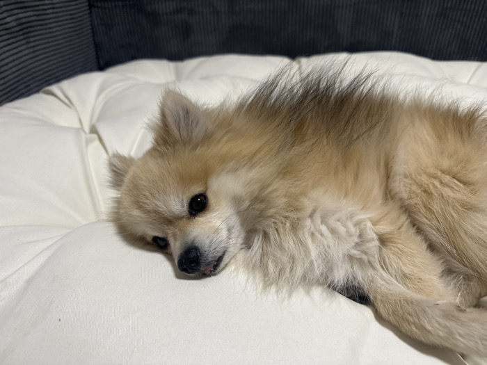 A small, light brown and blonde-furred canine, consistent with a Pomeranian breed, is depicted resting on a cream-colored, tufted cushion