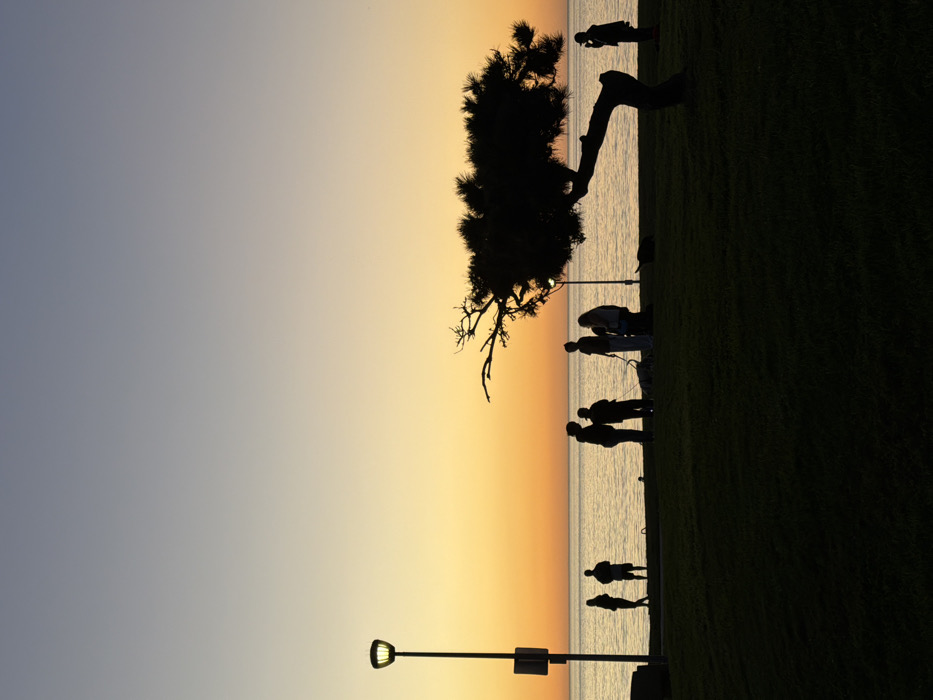 Silhouettes of people, a tree, and lampposts stand against a gradient sky and a strip of water. The scene is sharply divided between a dark foreground of grass and a lighter background. Several people are gathered near the center, some appearing to stand or walk. The tree leans towards the water. One individual stands alone at the edge of the image, near the top.