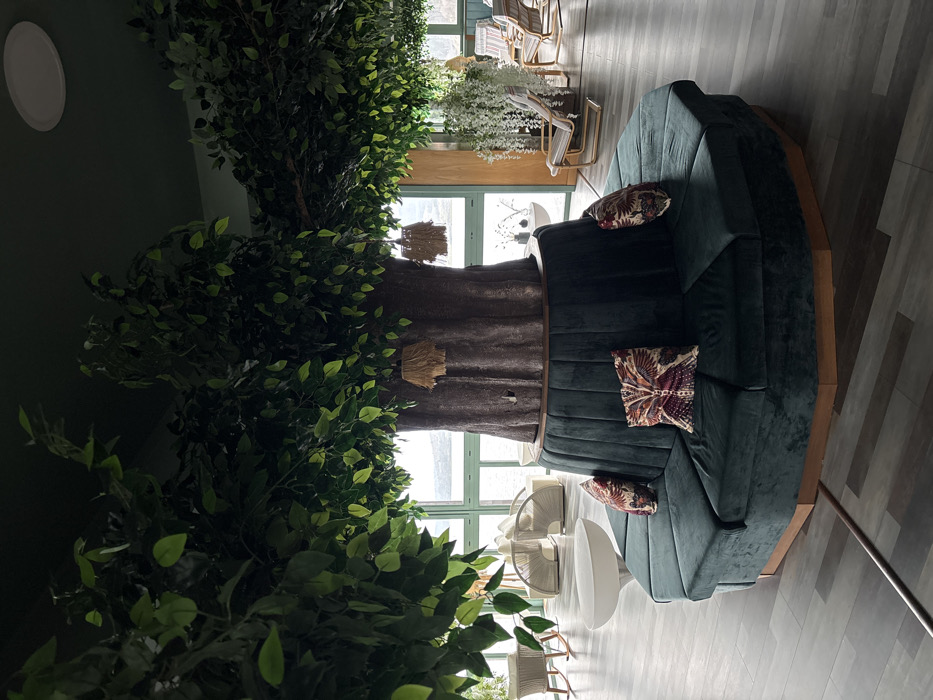 This image depicts an interior lounge area, possibly a hotel or resort common space, located in the city of Баня, Bulgaria. The central feature is a large, artificial tree with a thick trunk and dense green foliage that spreads across the dark green ceiling. An octagonal seating arrangement in dark green velvet upholstery with a wooden base encircles the tree trunk, adorned with three patterned throw pillows. Two decorative elements, resembling woven straw lanterns, hang from the tree's branches. To the left, beyond the central seating, are two light-colored, contemporary woven armchairs with high backs and a white mushroom-shaped side table. Further left, a light-colored rocking chair is partially visible. The background consists of large, floor-to-ceiling windows with light green frames, offering a view of a calm body of water, likely a lake or reservoir, with a distant landmass or mountains under an overcast sky. On the right side of the image, additional seating areas include several lounge chairs or recliners with striped fabric, positioned near more hanging white artificial plants. The floor is covered with light gray, wood-effect planks. A circular recessed light fixture is visible on the dark green ceiling in the upper right quadrant. The scene is devoid of people.