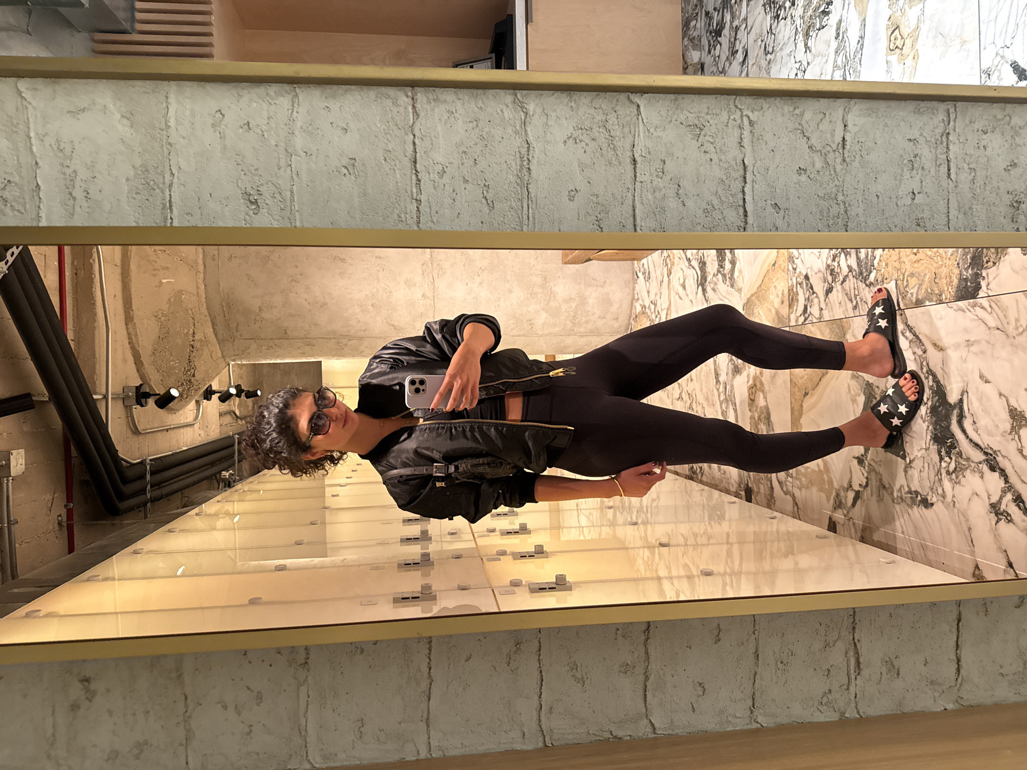 A woman is taking a photo of herself in a mirror. She is wearing black leggings, a black jacket, and black sandals with white stars. She is holding her phone in her right hand, and she is looking at the camera. The mirror is framed in gold and is in front of a wall that is patterned with marble on the top and concrete on the bottom. The location appears to be somewhere in the city of West Hollywood, United States of America. Black pipes run along a nearby wall.