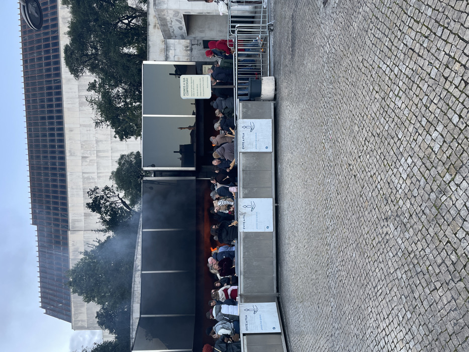 A gathering of people are standing behind metal barriers. Smoke fills the background. The barriers are marked with signs in a foreign language and candle icons. A large building is visible on the left with trees positioned between it and the crowd. The ground appears to be stone. Some individuals stand near a sign that says "PEDIMOS A SUA COMPREENSÃO." The scene suggests an event or place where candles are burned, potentially a memorial or religious site.